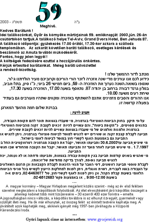 Az 50-ik emleknaprol erkezett felvetelek. A beszedet tartok es resztvevok nevsorat igyekezunk majd kesobb szinten -amennyire ez modunkban lesz - megjelentetni. A kepek kozzetetele Janai Rachel es Itchak (Isr.)es Lonyai Sandornak (Hung) koszonheto. 05.06.2003