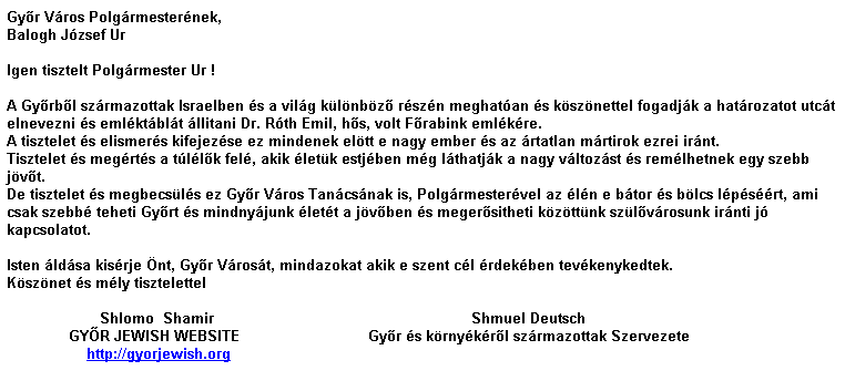 levelünk a győri Hitközség vezetőségéhez